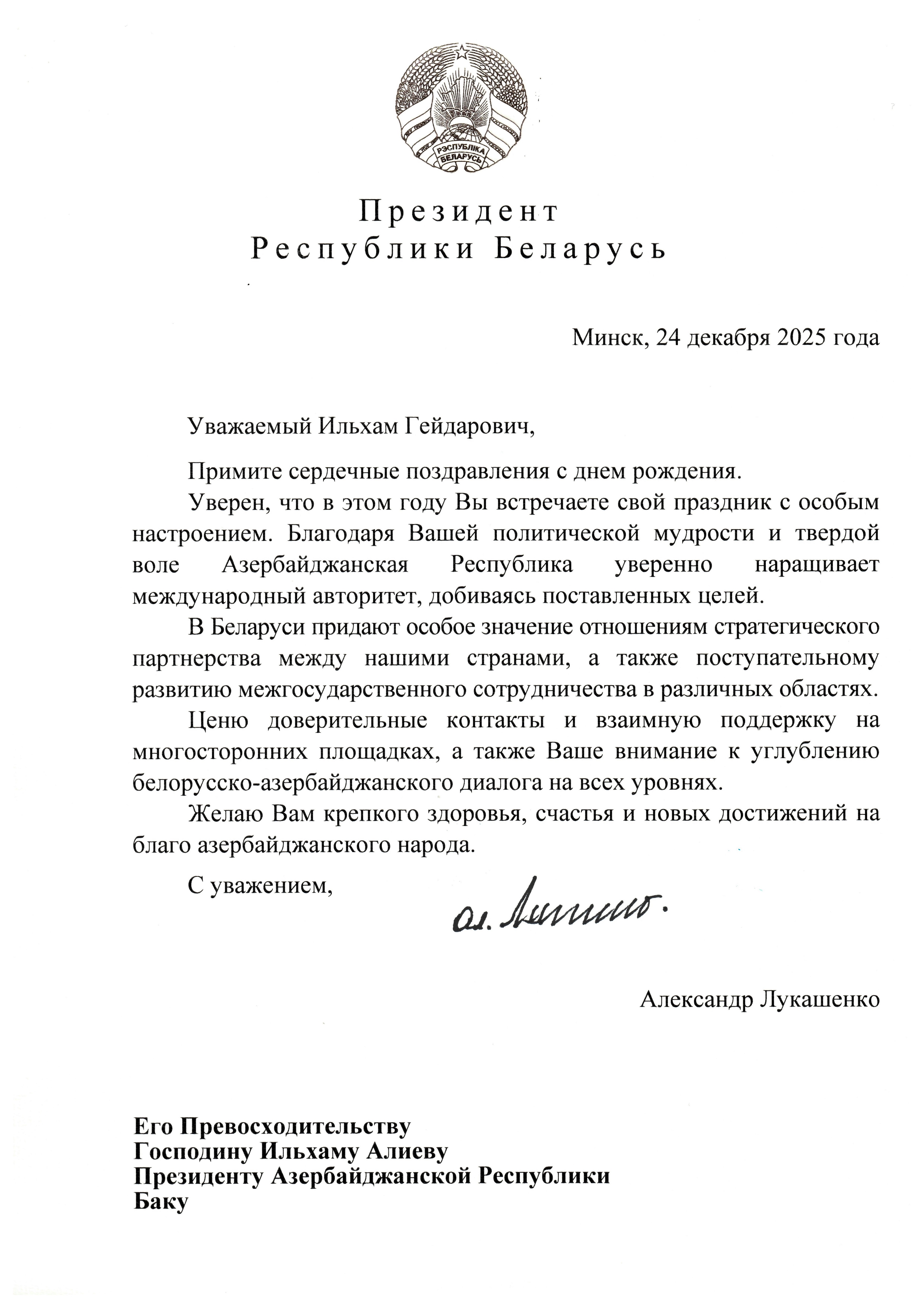 24.12.2025 г.Президент Беларуси Александр Лукашенко поздравил Президента Азербайджана Ильхама Алиева с днем рождения.